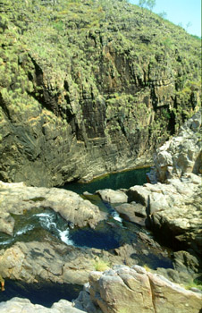 Zum abendlichen Barbecue kommt Wind auf, der zuweilen unsere Tischkerzen ausbläst. Er legt sich aber wieder, und so ziehen wir uns nach einigen "Cold beers" zurück; zum Schlafen hatten wir einen sogenannten Swag ausgefasst - eine Art imprägnierter Schlafsack aus Segeltuch, der zur Not auch vor Regen schützen soll. Gegen drei Uhr früh spüren wir wirklich ein paar Tropfen und wollen uns zunächst verkriechen, doch sehr bald wird der Regen stärker, Marke Wolkenbruch, und geht dann später in einen Landregen über. Zum Glück hatte Simon vorsorglich eine riesige Plane aufgestellt, und in panischer Eile bringen wir unsere Zelte ins Trockene. So ein Tropenregen mitten in der Trockenzeit - hat man nicht alle Tage!